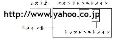 このとき、「co」は「jp」ドメインのサブドメイン、「yahoo」は「co」ドメインのサブドメインと呼ぶことがあります。特に、末端の識別子(ここでは「www」、「yahoo」のサブドメイン)のことを 「ホスト名」と言います。